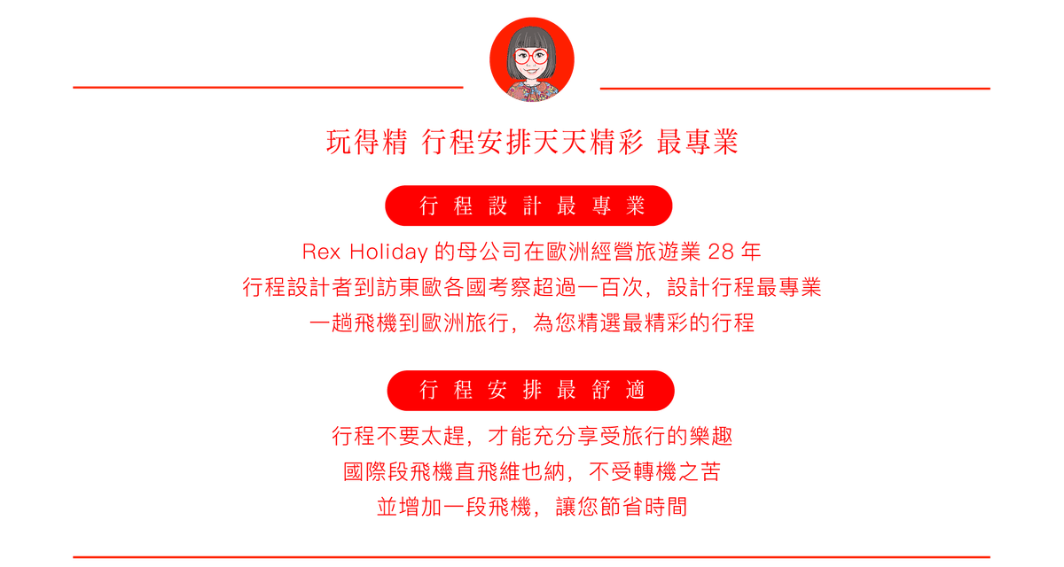 全程住宿十四晚,安排三個城市住宿兩晚以上,一來不趕行程,二來可以讓旅客有時間洗衣服