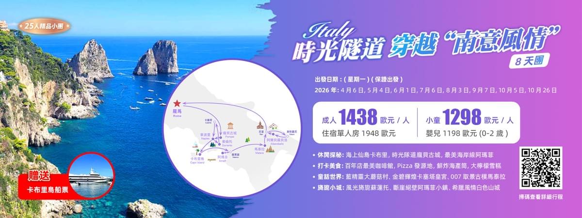 遊覽:阿瑪菲海岸、卡布里島、龐貝古城、馬泰拉、阿爾貝羅貝洛、奧斯圖尼、卡塞塔、拿波里.