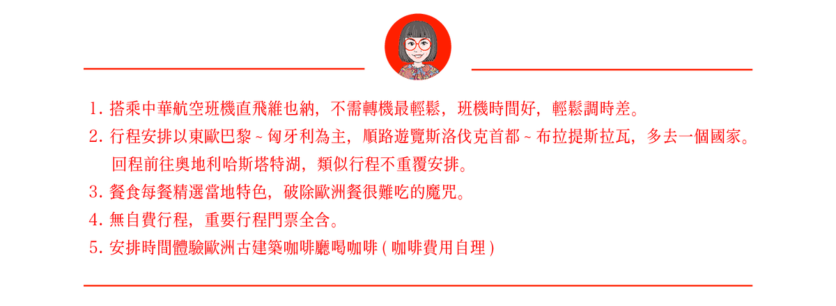 - 餐食包含:早餐:飯店早餐,午餐: 匈牙利豬腳餐,晚餐:義大利特色餐