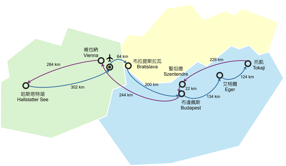 - 行車距離:維也納 > 64km/ 54mins 布拉提斯拉瓦 > 200km/ 2hrs 21mins 布達佩斯