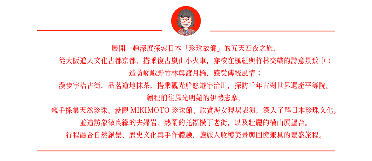 造訪位於伊勢志摩的【Mikimoto珍珠館】,深入探索世界頂級珍珠的誕生地。特別安排「親手取珍珠體驗」,親自打開珍珠貝,感受從大海孕育出的天然珍寶,了解珍珠養殖的精細工藝與歷史背景。體驗後,更可親自參與「製作世界獨一無二珍珠飾品」,將親手取得的珍珠設計成專屬飾品,不僅充滿紀念價值,更是旅途中最具意義的獨特回憶。
